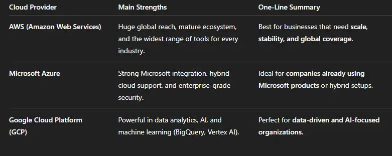 Before diving deep, here’s a quick look at what makes each major cloud platform special. Think of it as a snapshot of strengths – simple, clear, and helpful for quick comparison.